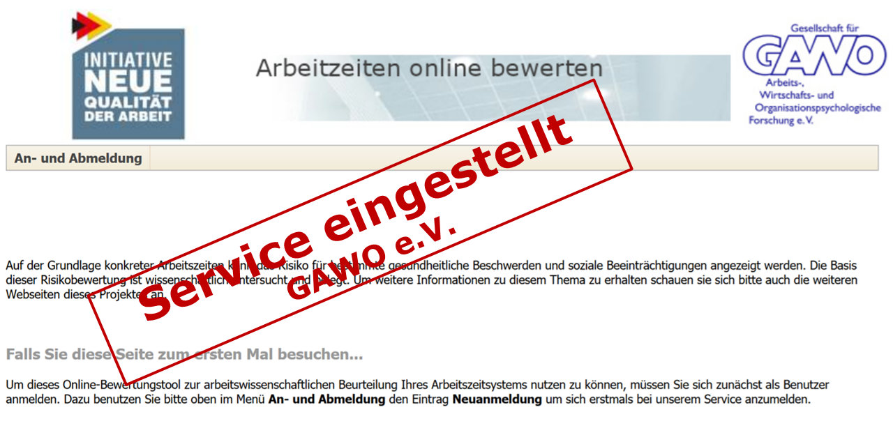 Weiterbetrieb und Weiterentwicklung des bisher frei im Internet verfügbaren Instrumentes „Arbeitszeiten online bewerten“ (AZOB) mussten mangels Verfügbarkeit eigener oder fremder Ressourcen für diesen Zweck bis auf weiteres eingestellt werden.